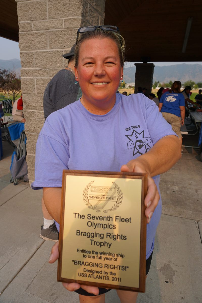 Captain Erica Stark shows off the Bragging Rights trophy that was held by the USS Ticonderoga.