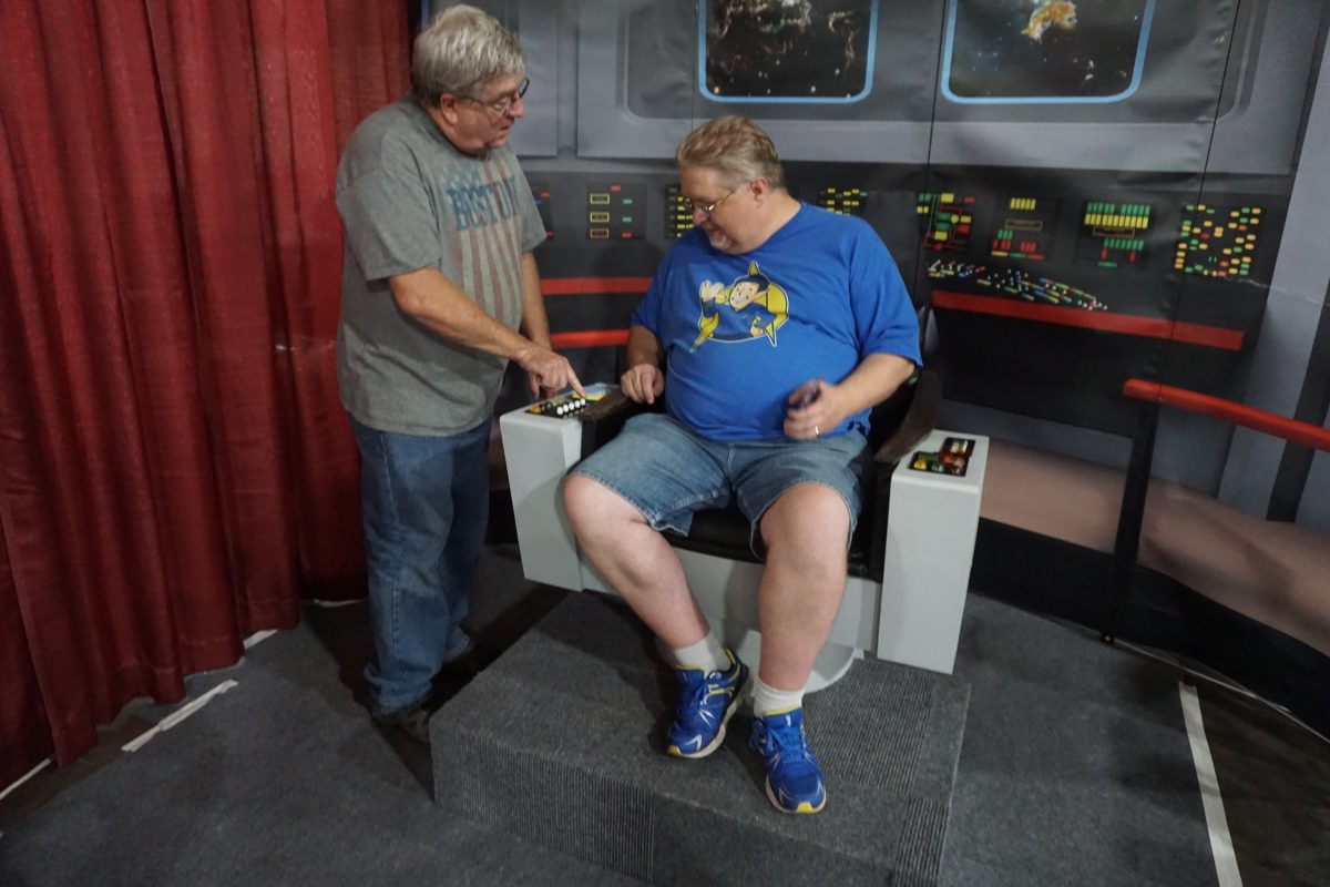 Admiral Hunsaker shows Admiral Stark the features of Captain Kirk's chair at FanX 2018.