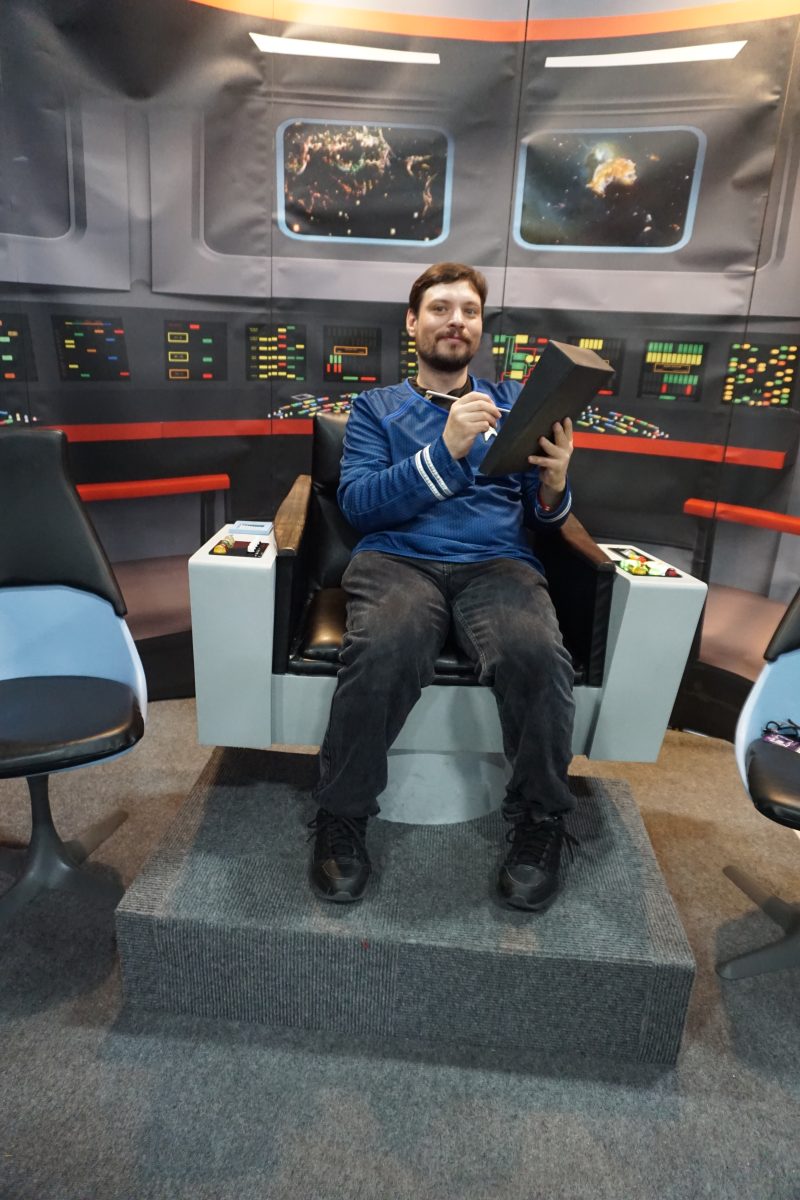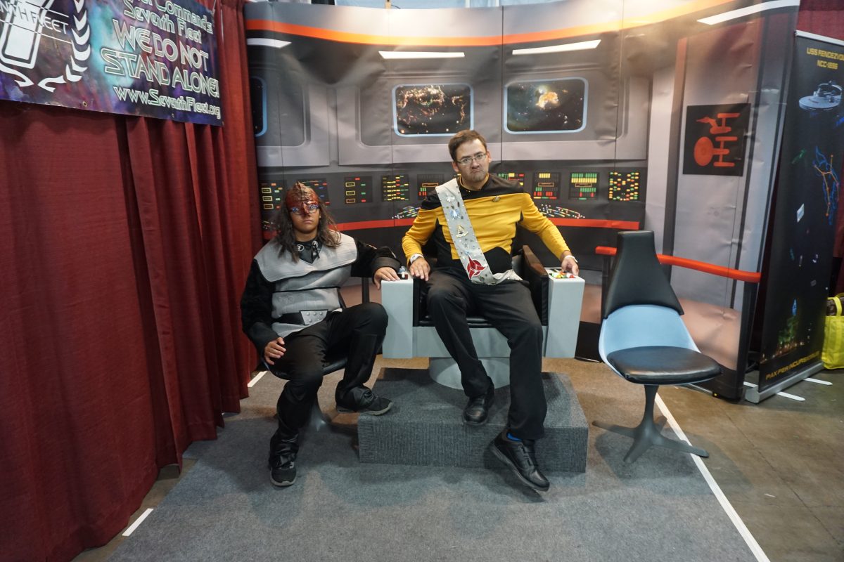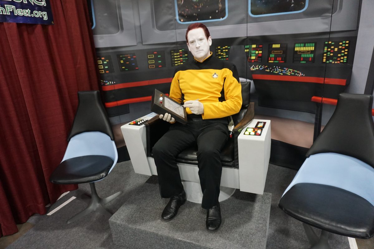 Commander Data sits in the Captain's Chair at the Seventh Fleet booth at FanX 2018.