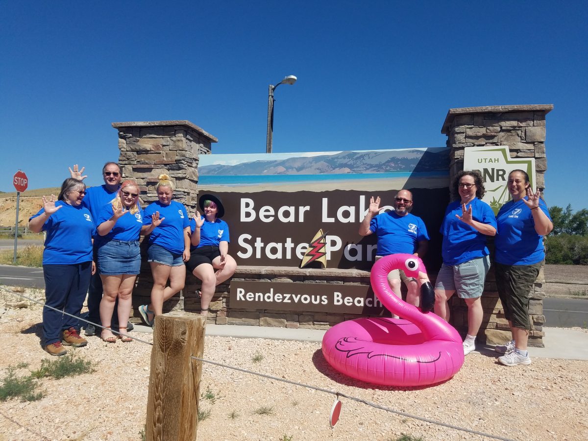 The crew of the USS Rendezvous on Rendezvous Beach at Bear Lake.